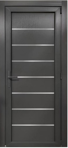 Дизайн: гладкое дверное полотно с горизонтальными алюминиевыми линиями, создающими ритмичную геометрию.