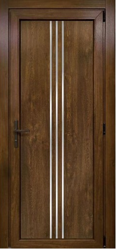 это сочетание изысканного дизайна и надежности. Теплый коричневый оттенок с выразительной текстурой древесины делает дверь не только функциональной, но и декоративным элементом интерьера. Благодаря современному оформлению с горизонтальными алюминиевыми вставками, она гармонично вписывается как в классические, так и в современные стили.