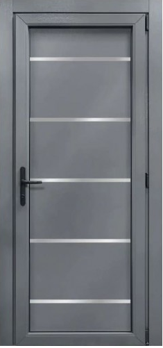это сочетание элегантного дизайна, прочности и практичности. Лаконичный серый оттенок и горизонтальные алюминиевые вставки придают двери современный и утончённый вид, который идеально впишется в любой интерьер — от минимализма до лофта.
