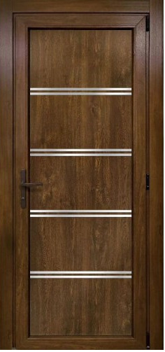 это сочетание изысканного дизайна и надежности. Теплый коричневый оттенок с выразительной текстурой древесины делает дверь не только функциональной, но и декоративным элементом интерьера. Благодаря современному оформлению с горизонтальными алюминиевыми вставками, она гармонично вписывается как в классические, так и в современные стили.
